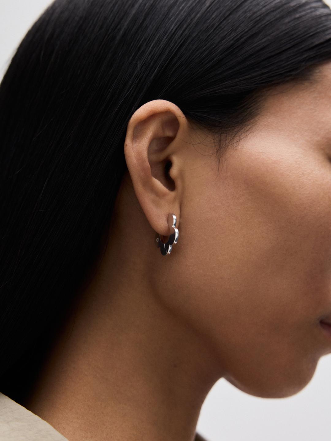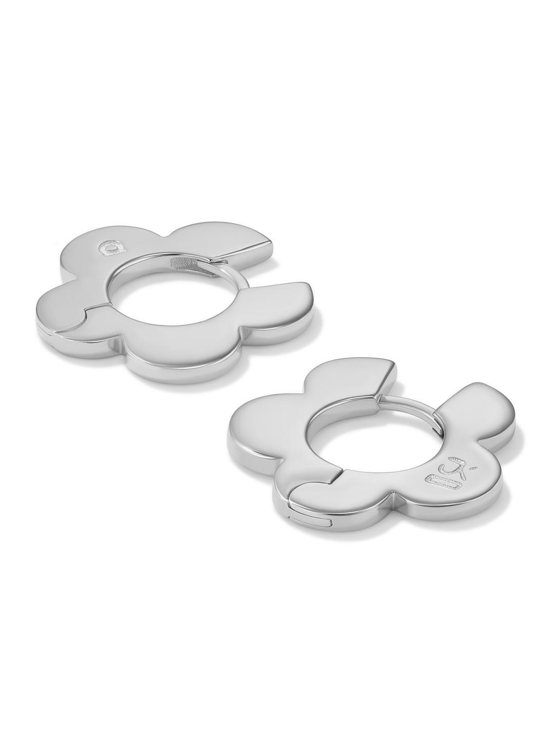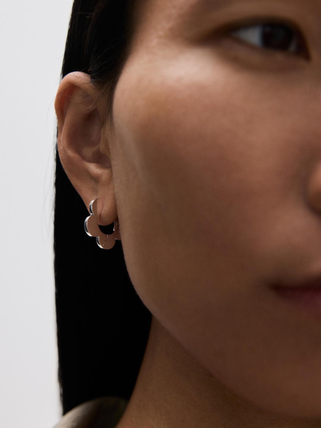 The medium-sized flat hoop earrings gently embrace the earlobes. The cinquefoil silhouette is shaped to echo J. Kim's signature petals. The logo has a stamped effect on dough-like metal.