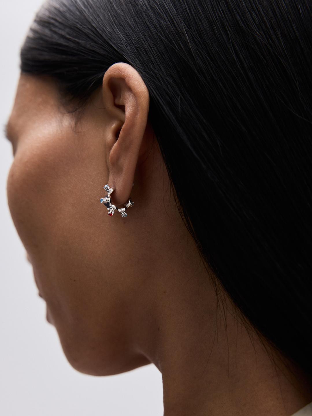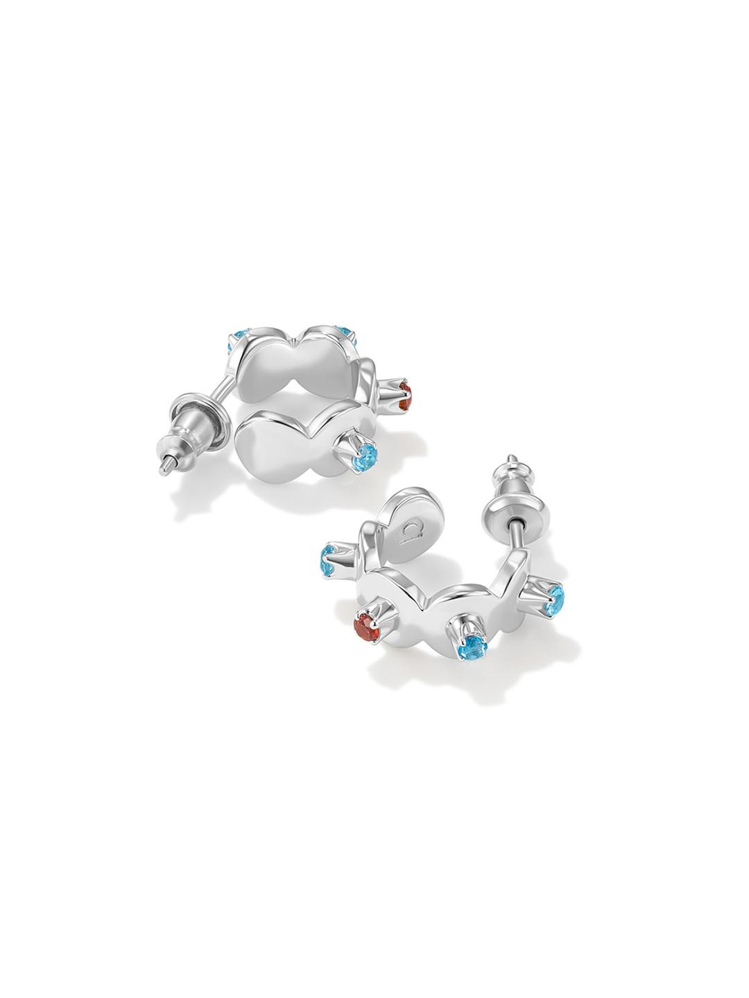 This petite pair of earrings features two natural gemstones: blue topaz and deep red garnet.