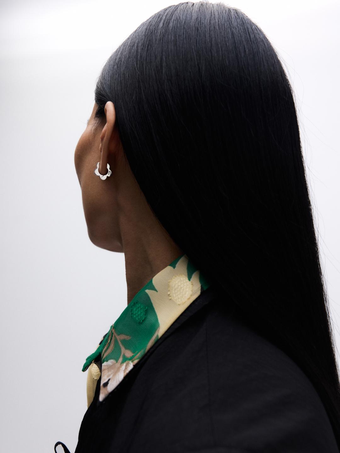The everyday flat hoop earrings gently embrace the earlobes. The cinquefoil silhouette is shaped to echo J. Kim's signature petals. The logo has a stamped effect on dough-like metal.