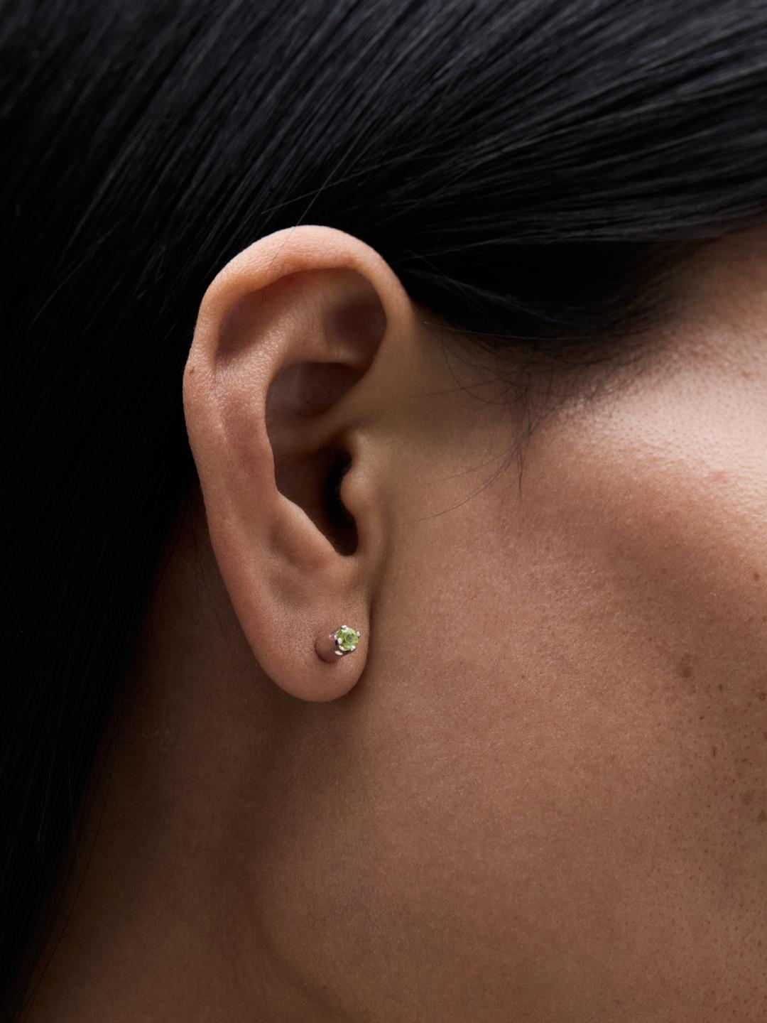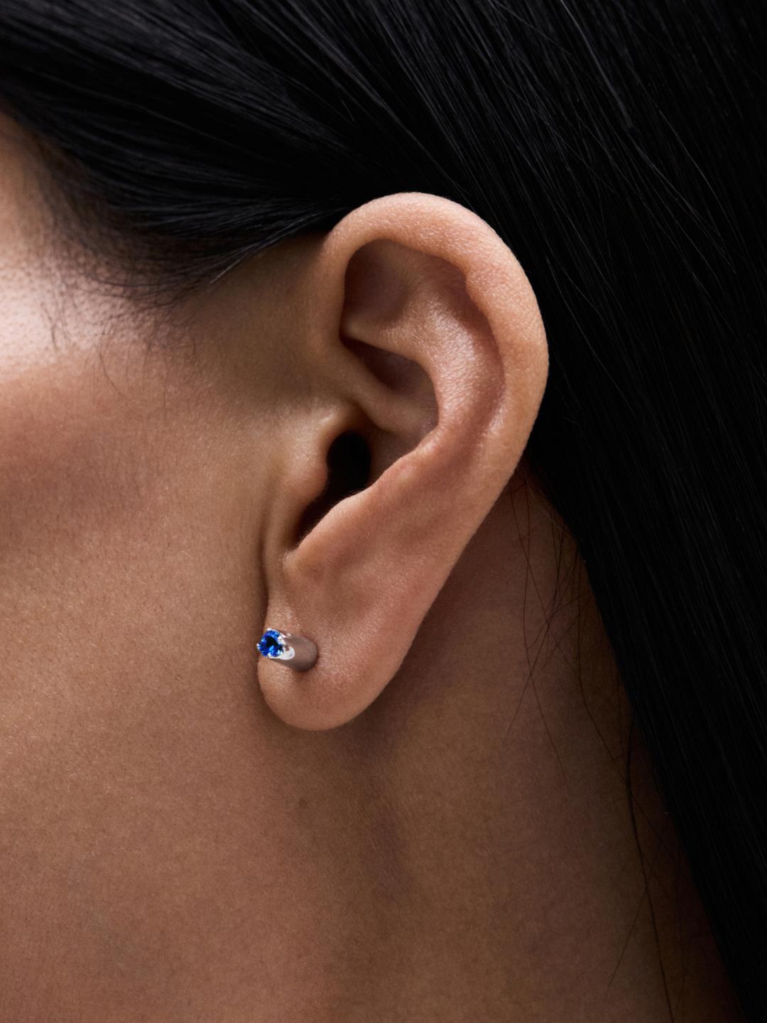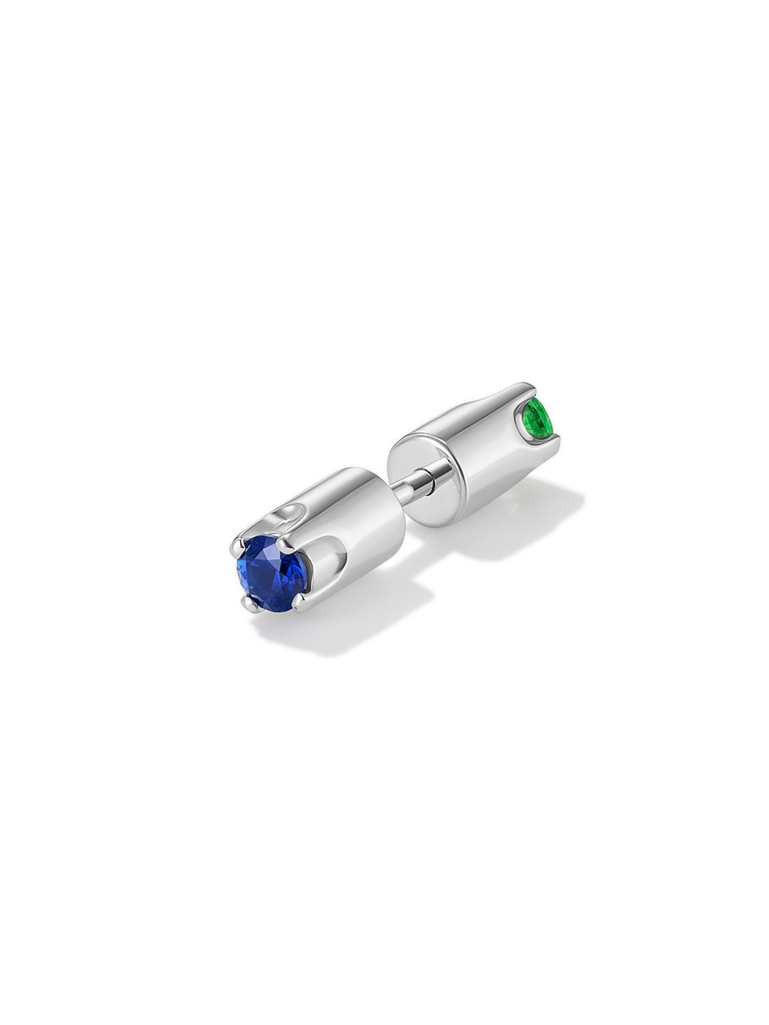 This earring belongs to the family of reversible studs at Avgvst. Set with a blue sapphire on one side and a green tsavorite on the other, it can be worn either way. The tiny prongs echo J. Kim's signature petals. Wear solo or create a matching or mismatched set.