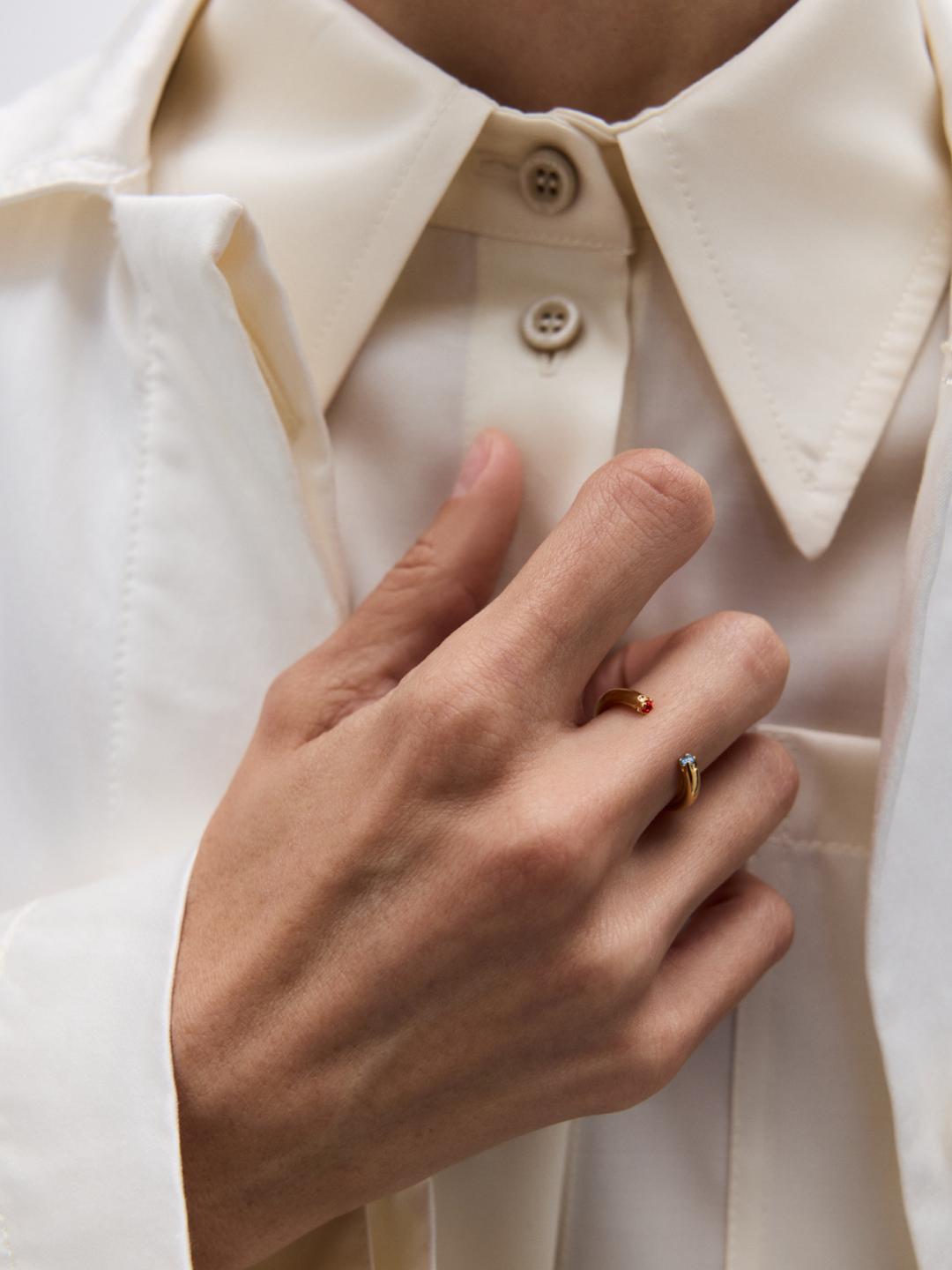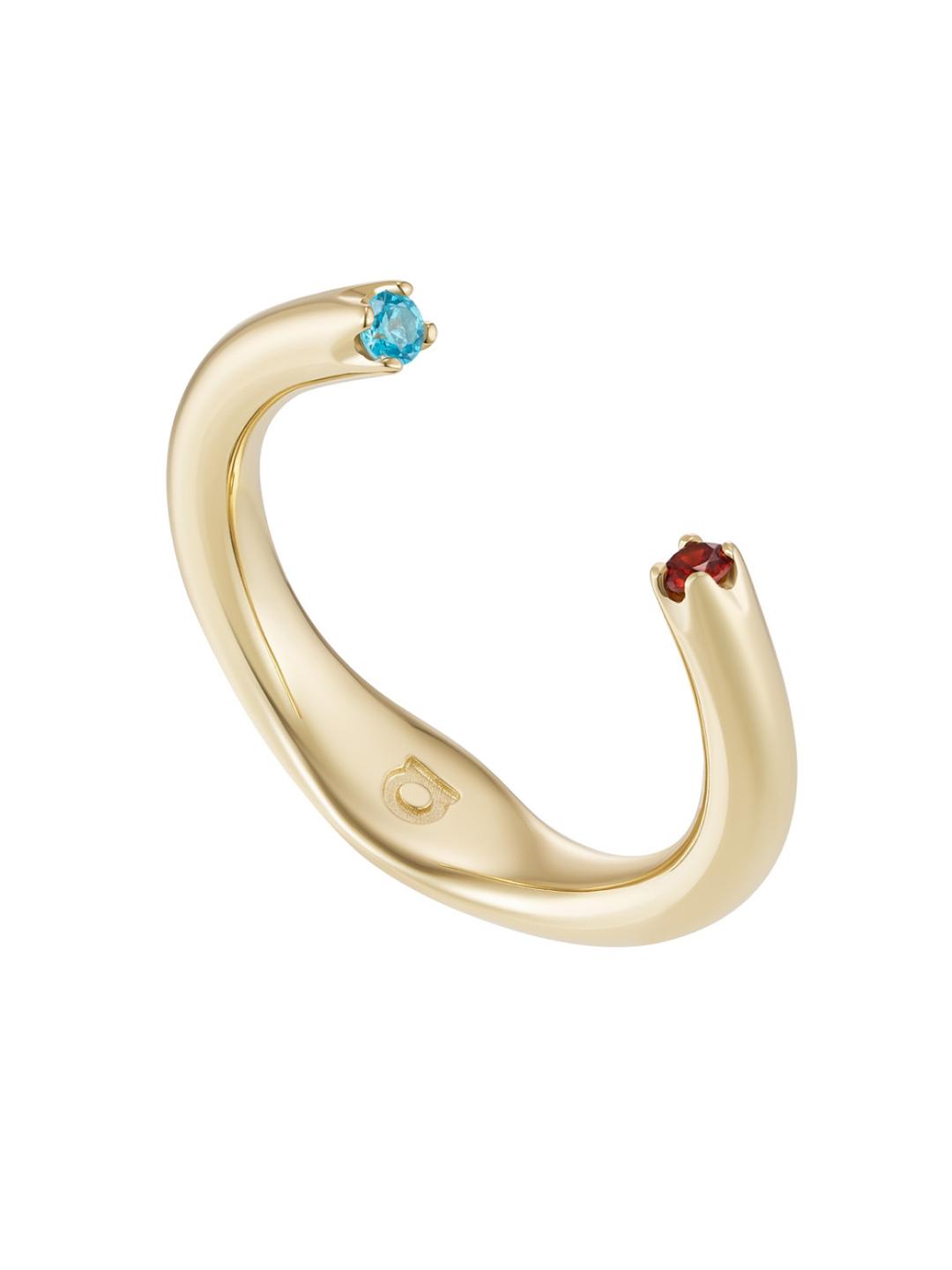 This ring, set with blue topaz and deep red garnet, takes the form of a cylinder that gently hugs the finger. The ends are slightly raised for a comfortable fit, while the tiny prongs echo J. Kim's signature petals. The logo has a stamped effect on dough-like metal.