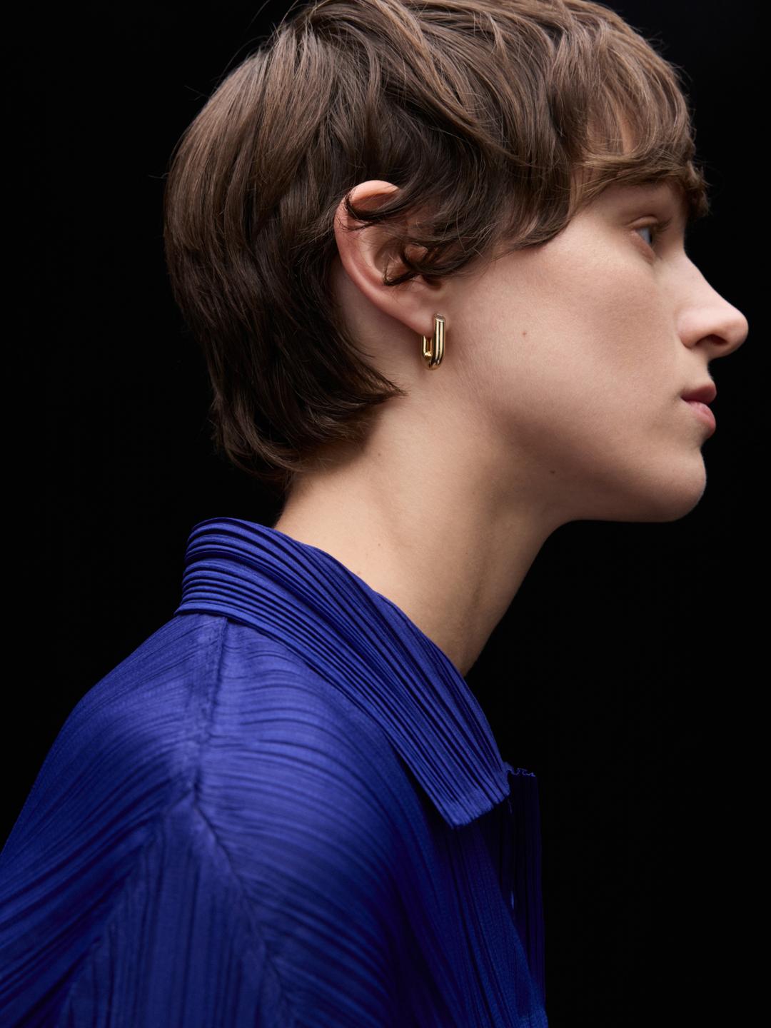 This design belongs to our family of special U-shaped earrings. Here, it takes the form of a bent branch, cut by shears. The vermeil and rhodium finishes are applied by hand.