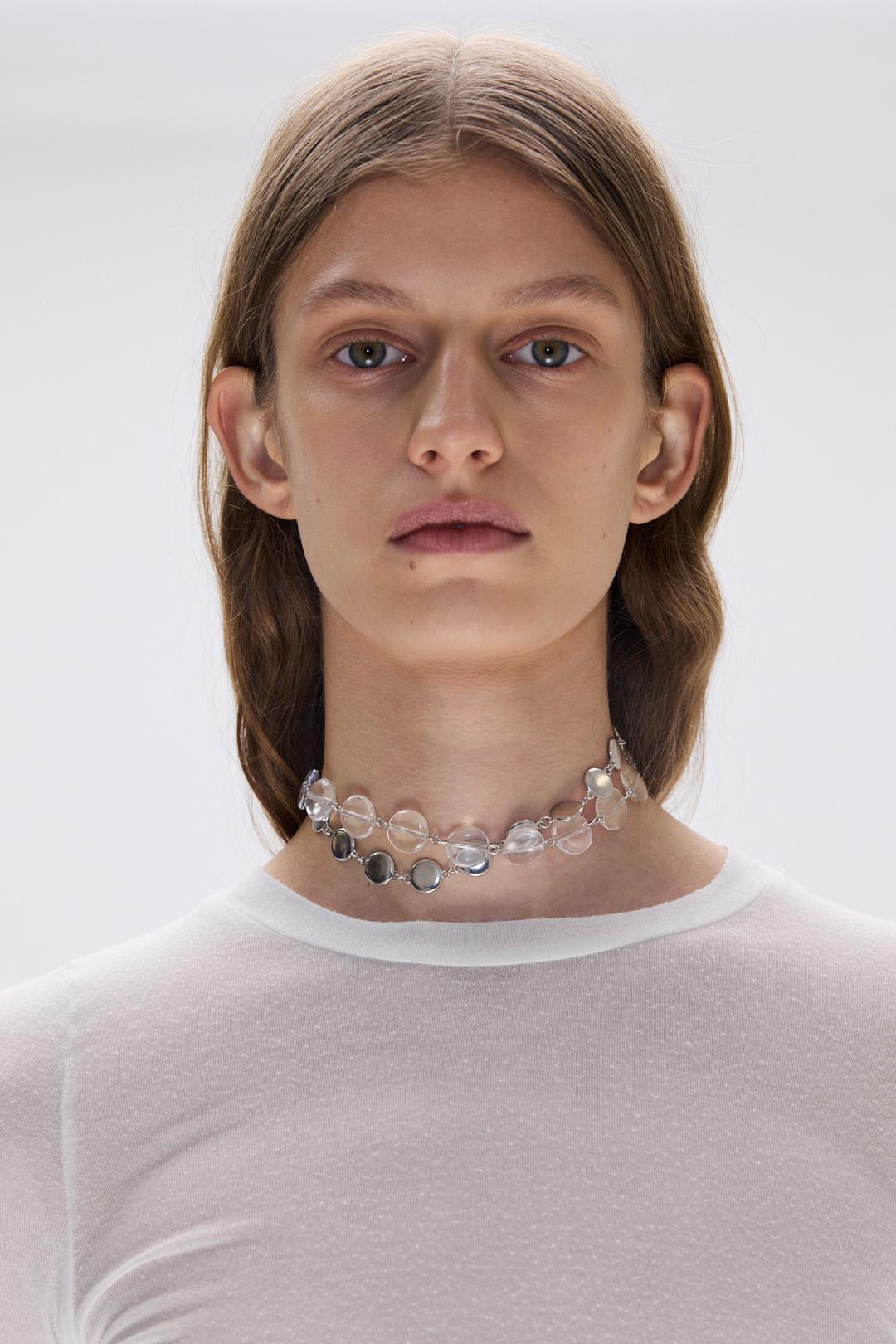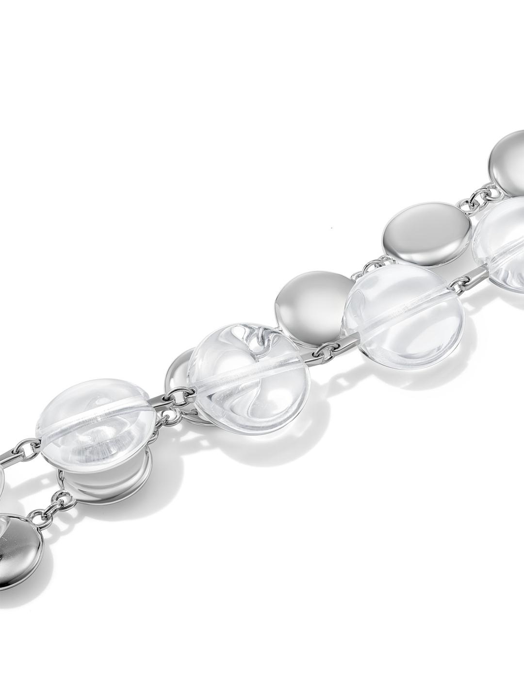 This necklace is composed of two separate pieces, one carrying silver discs and the other rock crystal discs. Their overlapping positions create a visual metaphor for an eclipse. All our rock crystal is hand-selected and hand-cut according to our designs. Each gemstone bead is polished by hand on both the inside and outside.