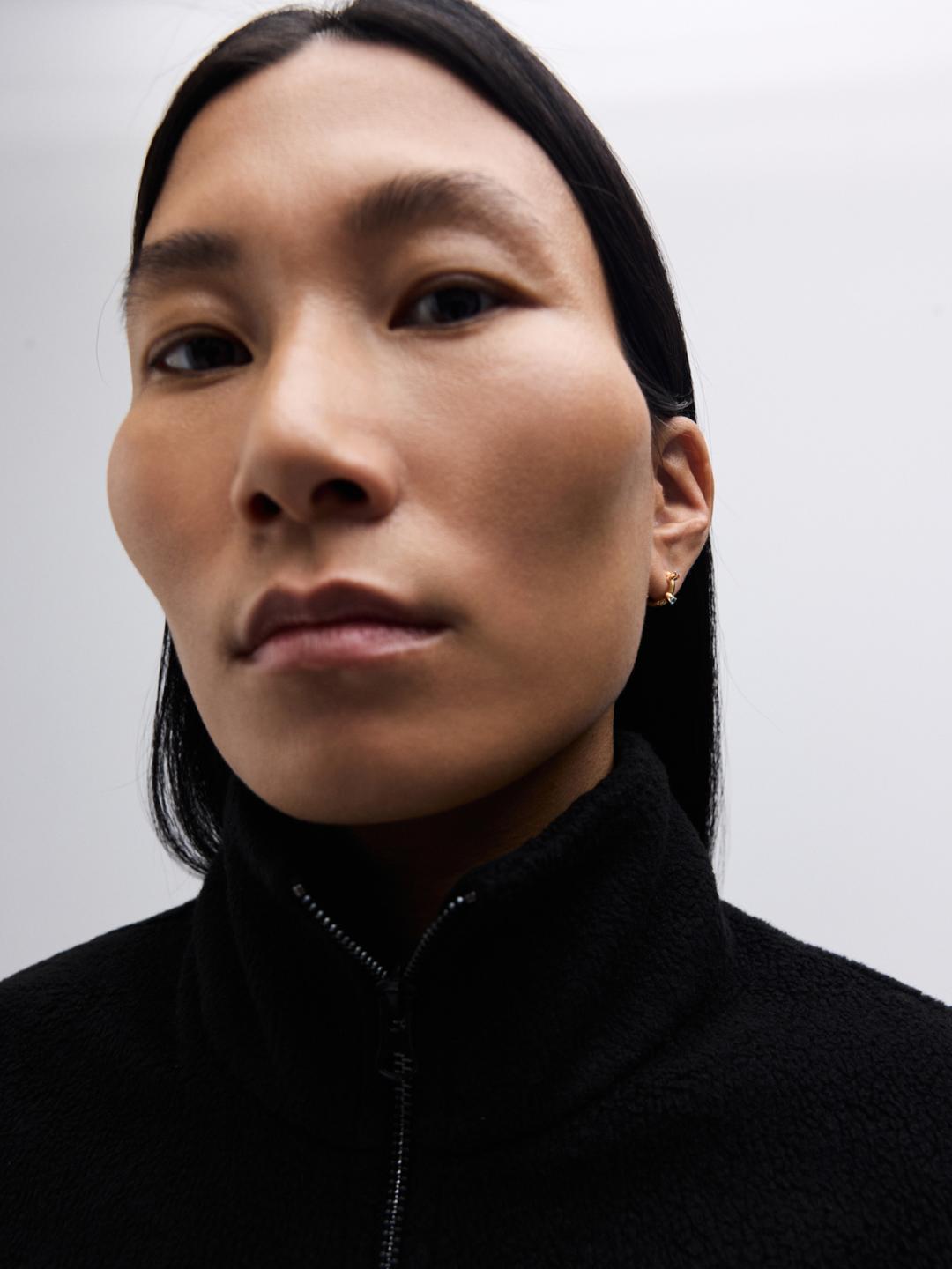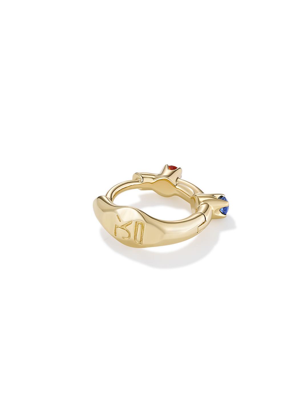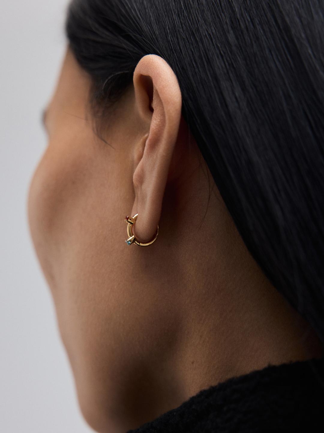 From the Avgvst x J. Kim hospitality collection: a clicker hoop designed for main, lobe, or cartilage piercings. Its tiny prongs echo J. Kim's signature petals.