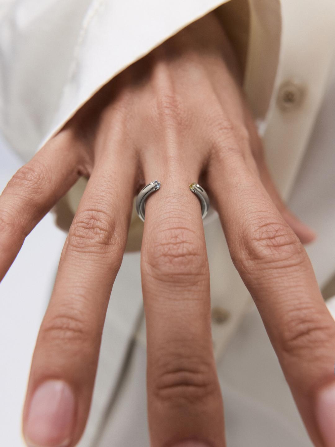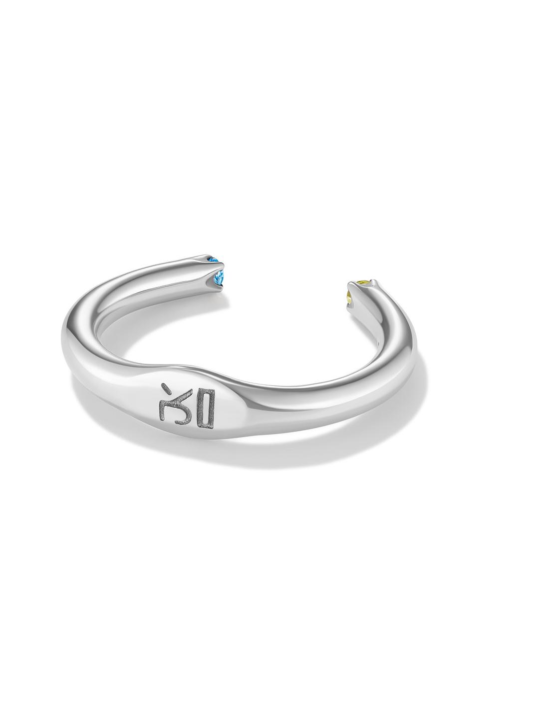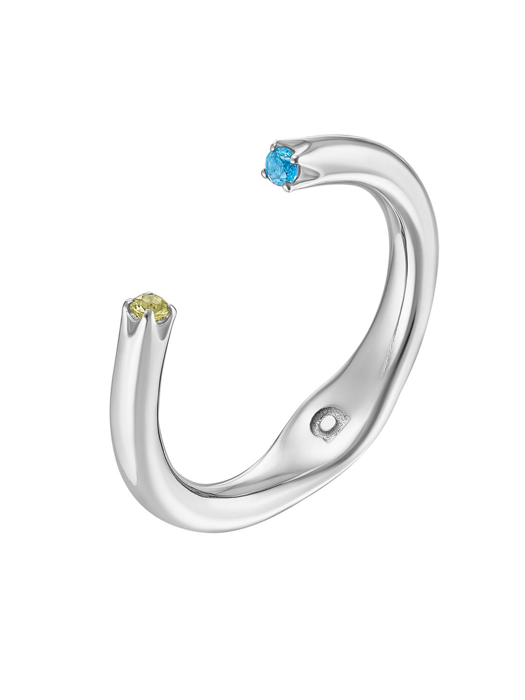 This ring, set with blue topaz and soft-green peridot, takes the form of a cylinder that gently hugs the finger. The ends are slightly raised for a comfortable fit, while the tiny prongs echo J. Kim's signature petals. The logo has a stamped effect on dough-like metal.