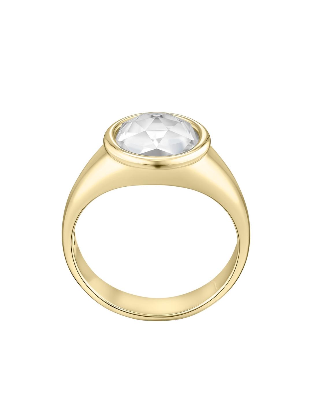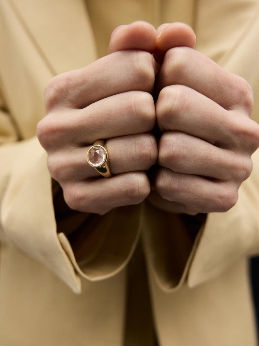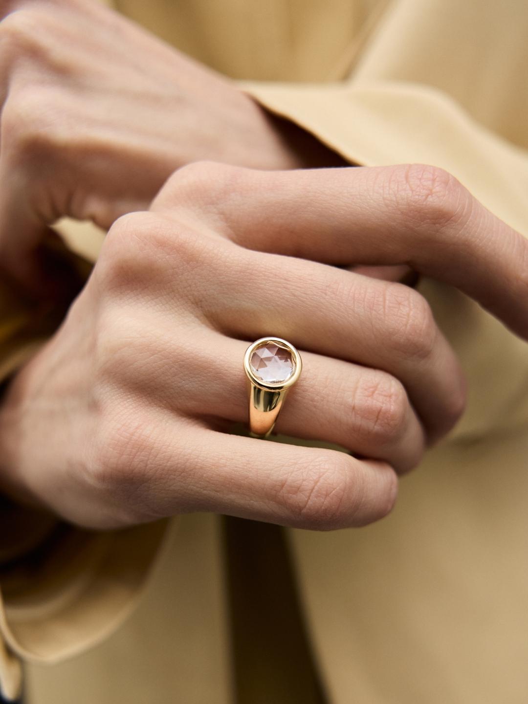 It's all about love, but not literally. The ring made of gold with hand-cut crystal was conceived under the impression of large modernist jewelry. The shape of the stone refers to the ancient diamond cut called "rose". And there's a a secret hidden on the inside of the ring: a pair of heart prints.