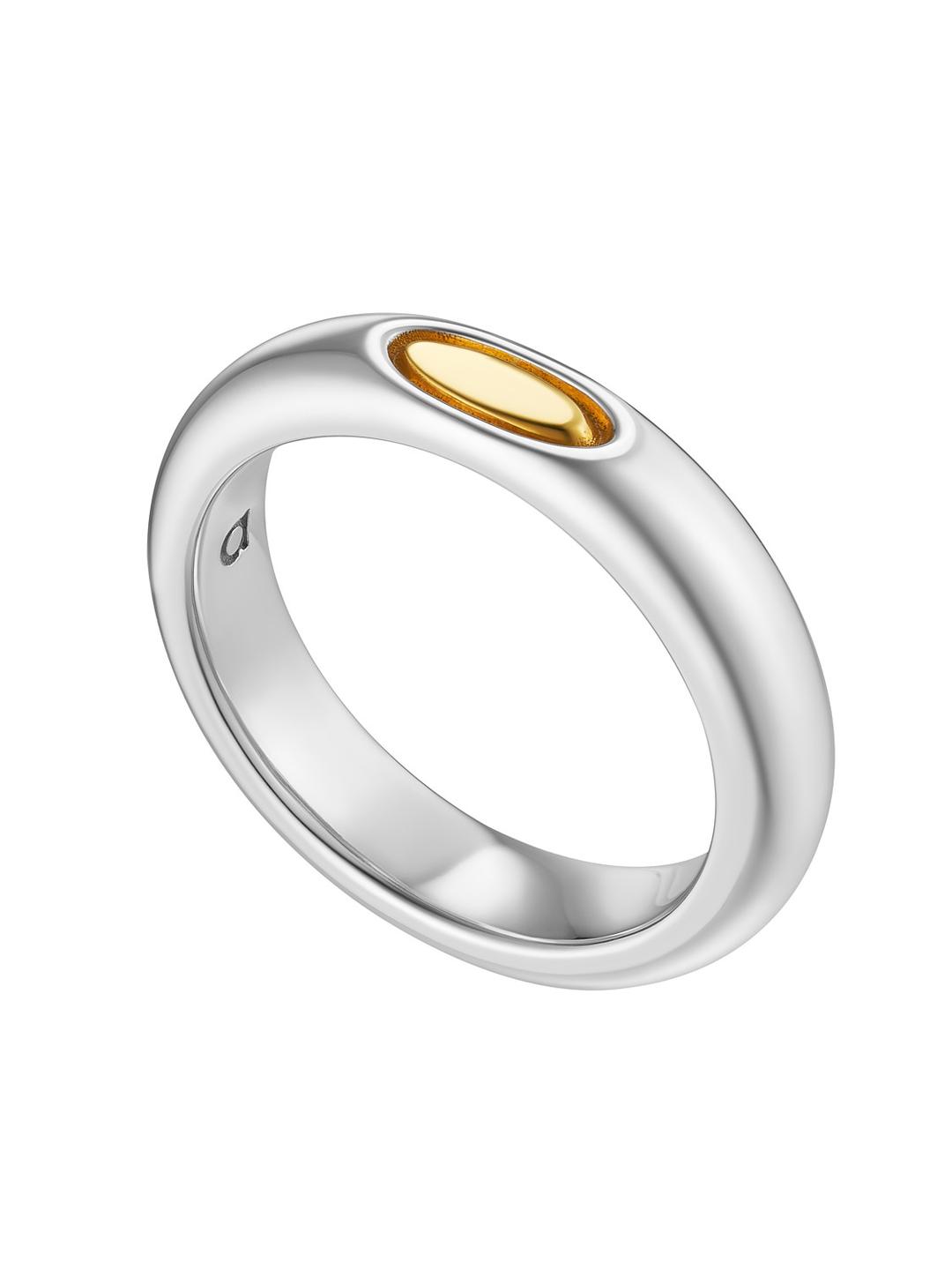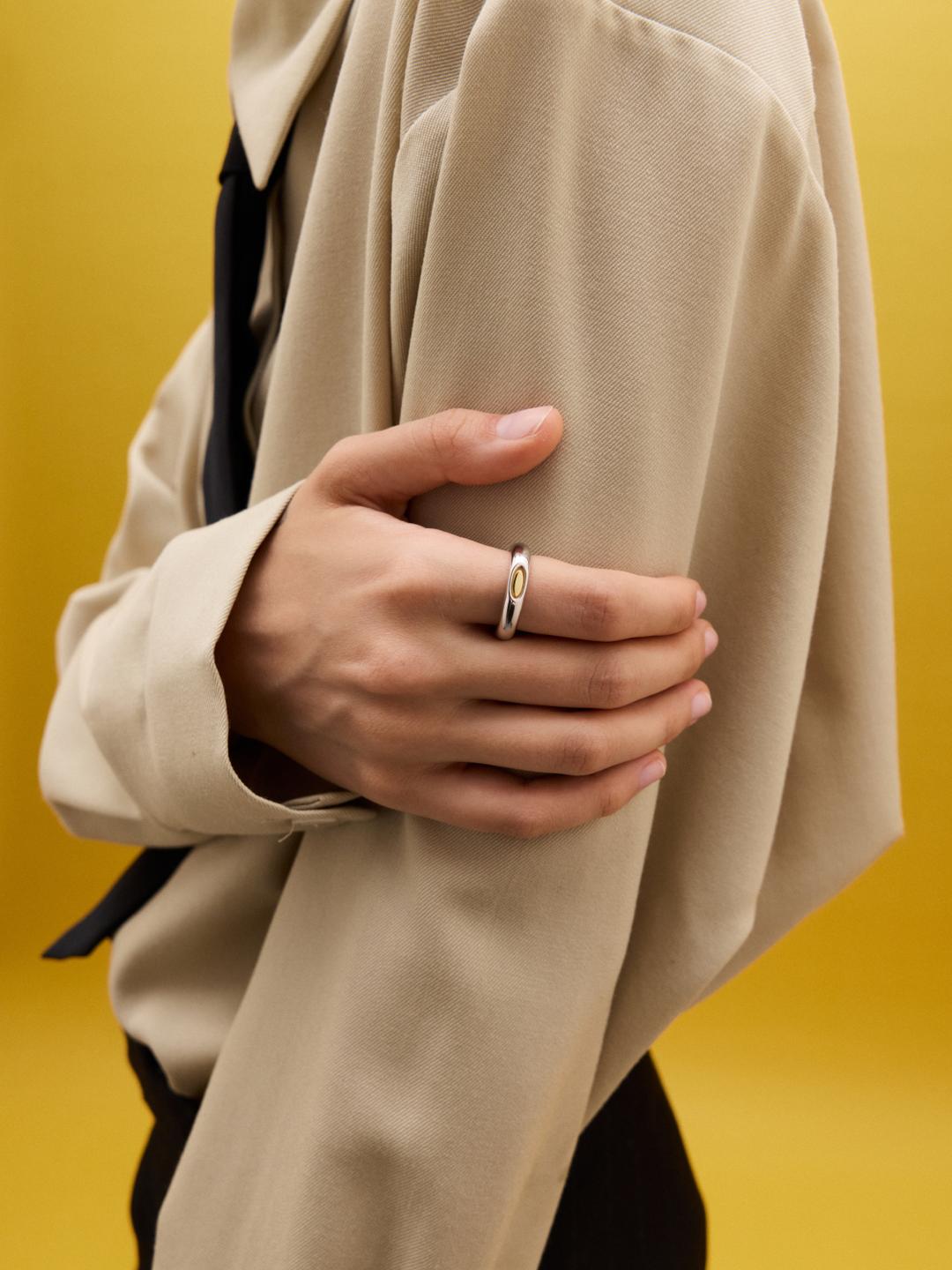 The clean band with a cut, reminiscent of a trimmed stem or twig. The vermeil and rhodium finishes are applied entirely by hand.