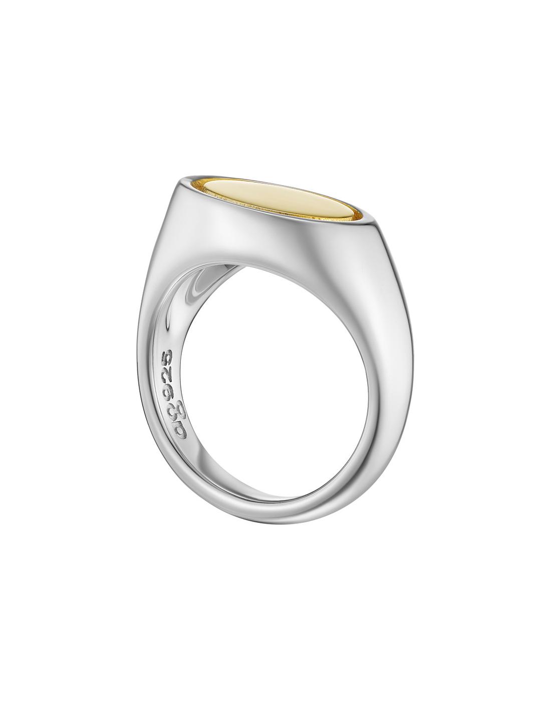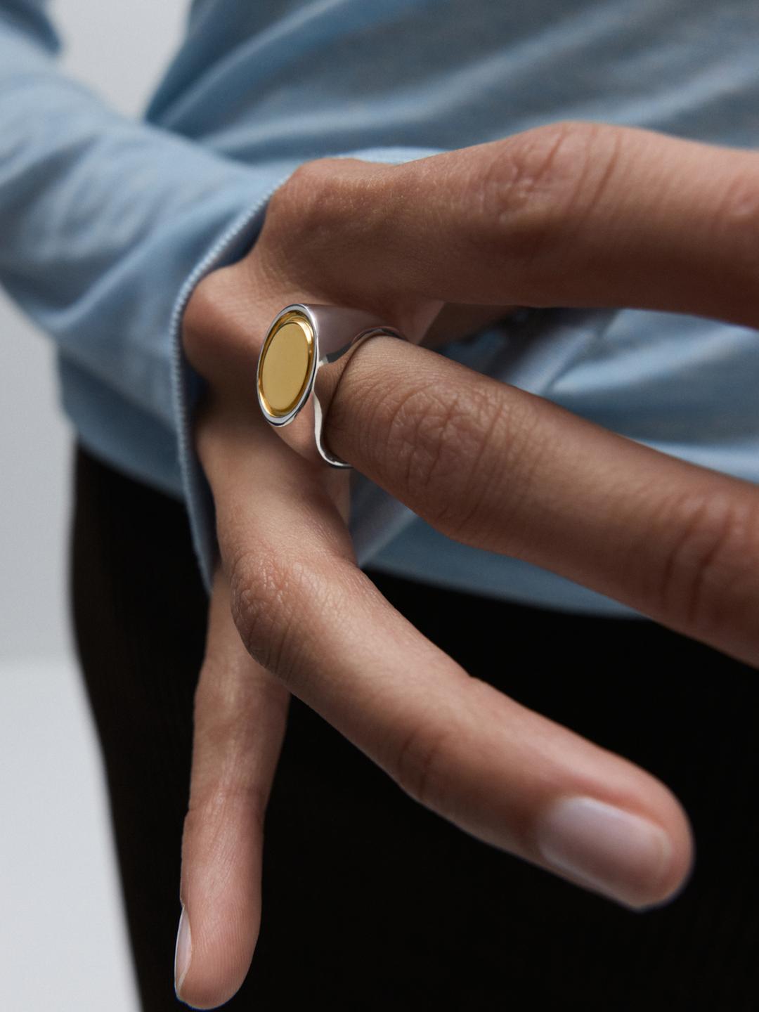 This signet ring has a slanted silhouette with a cut, reminiscent of a trimmed stem or twig. The vermeil and rhodium finishes are applied by hand.